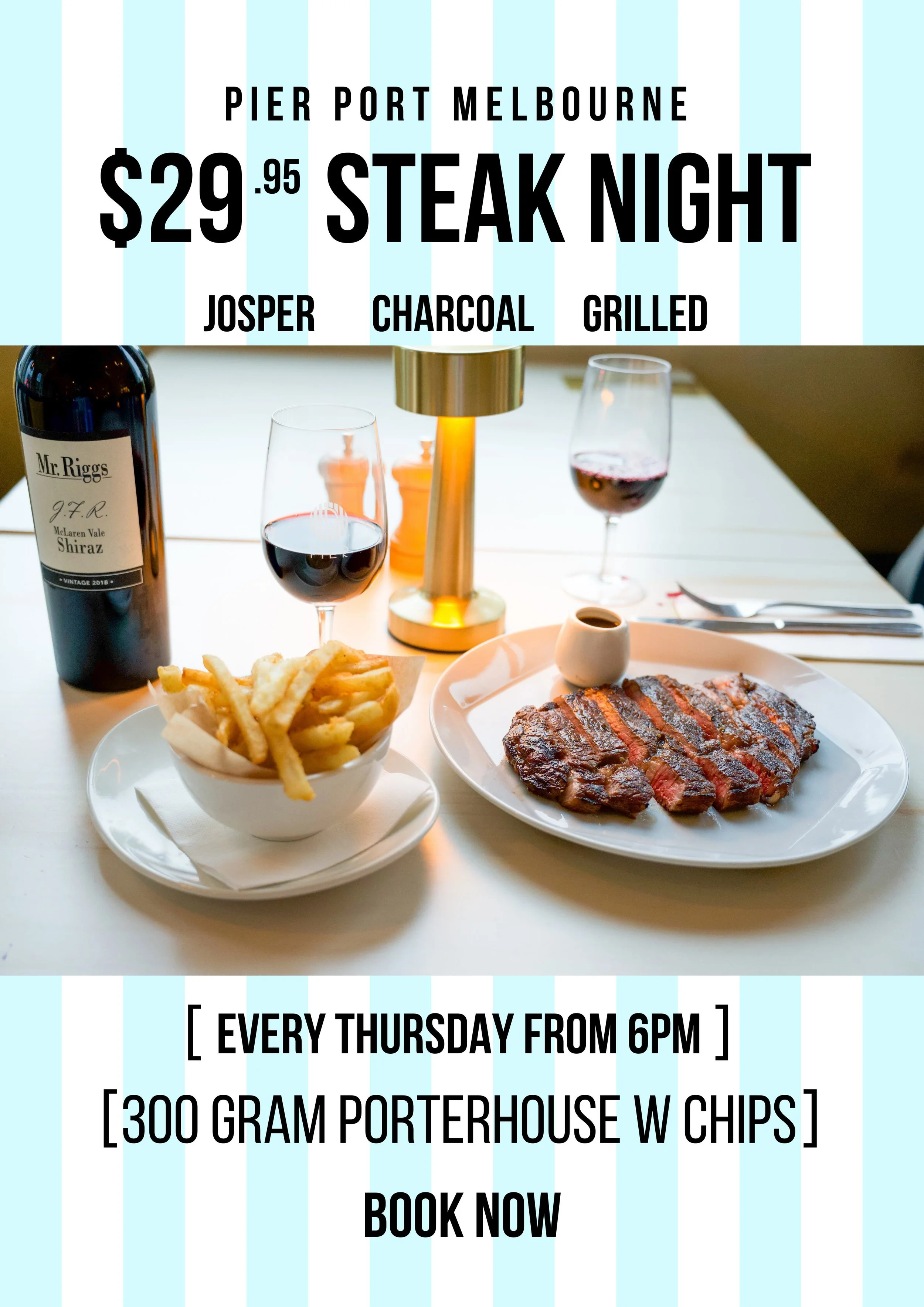 Join us every Thursday from 6pm for a 300g Southern Ranges MS2 porterhouse scotch fillet, cooked to your liking and served with chips and sauce.